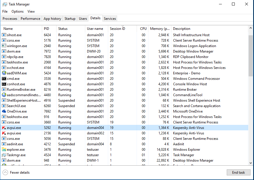 In this example of the TaskManager, user Domain004 and Domain002 have done a logoff, but the process "avpui.exe" does not terminate. User Domain004 and Domain002 can not login again, because in the perception of Windows, their session is still running because of the Kaspersky software "avpui.exe". And when Domain004 and Domain002 are attempting to login again, they are "connected" to their current session, and are presented with an empty, black desktop, because all other software in their session did properly terminate, so nothing is running anymore on their empty desktop, except "avpui.exe".