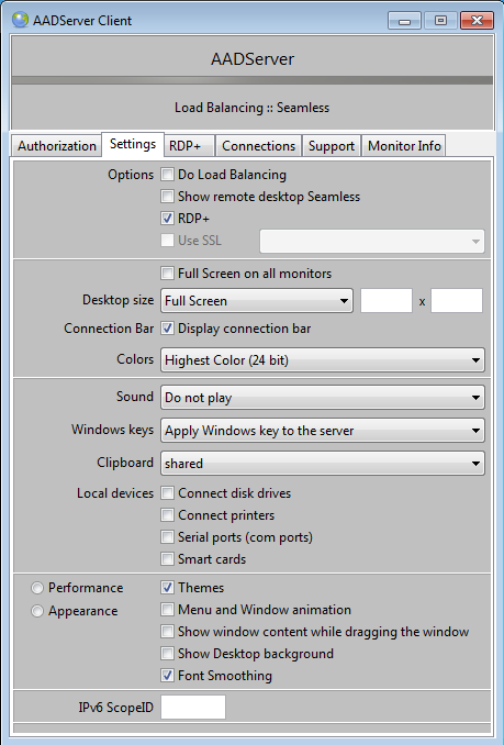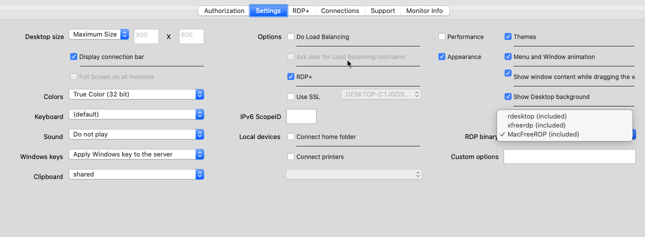 The remaining settings are similar to the settings in the Default RDP Client software from Microsoft.