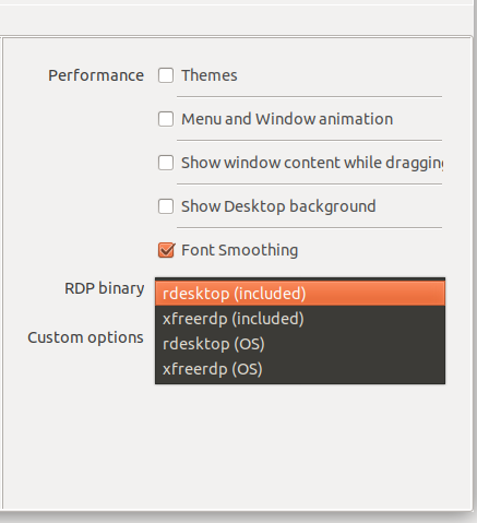 Custom options can be used to pass extra parameters to rdesktop or xfreerdp.