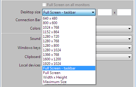 - The option "Full Screen - taskbar" will make sure that the taskbar of the Client will remain visible while working with the Remote Desktop.
