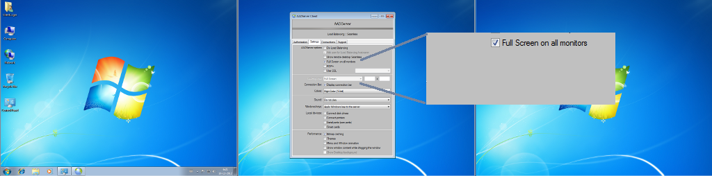 - If the Client has 2 or more monitors, the Remote Desktop will be shown Full Screen on the current monitor onto which the AADS Client is running.