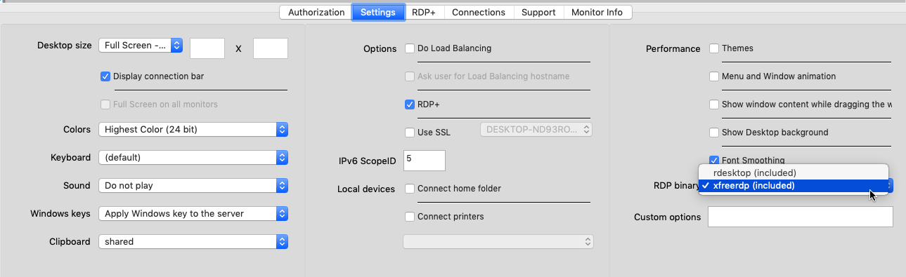 The Linux client have the option to choose between rdesktop or xfreerdp as the RDP Engine: