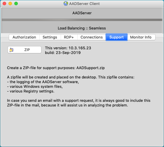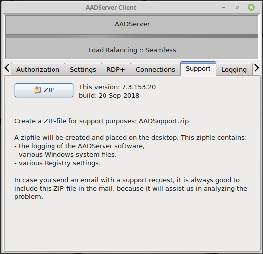 In case there are issues with the AADS Client Software, the tabpage Support contains a ZIP Support Button. By clicking on the button, a Client-ZIP-Support-File will be created on the desktop: