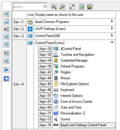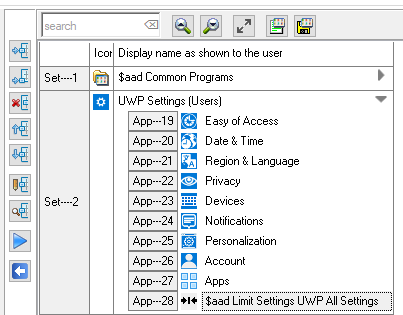 The directive "$aad Limit Settings" should be used within a Set containing Settings. This applies to either Control Panel settings or UWP settings .