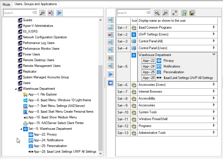 The Administrator has created a Set with Limited UWP settings for the Users in the Group "Warehouse Department":