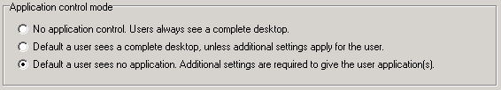 The second and third option turns on the Application Control. The difference between the second and third option is what a user sees in case no applications are available for the user. The second option will give the user a complete desktop without any restriction. The third option will show the remote user a message that the Administrator has not made any application available for the user. The remote user is not able to continue to work:
