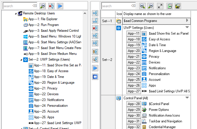 In this example the directive $aad Show this Set as Panel is added to the Set UWP Settings (Users).