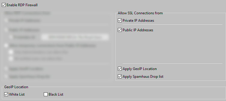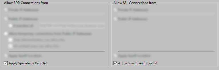 Spamhaus Drop List should be used with RDP connections. For SSL connections is Spamhaus Drop List is less relevant because the SSL Gateway does only allow connections from known Client PCs.