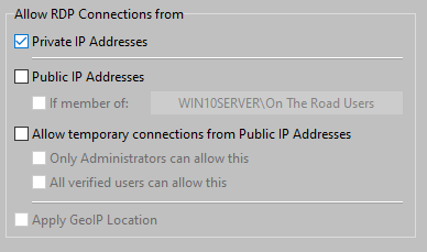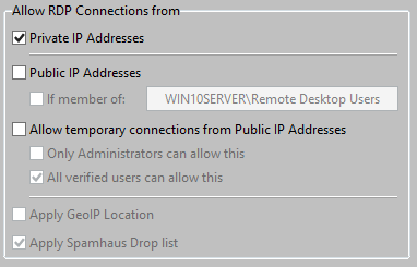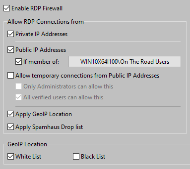 When allowing RDP Connections from Public IP Addresses for all users, be sure to use the Spamhaus Drop List and the GeoIP list.