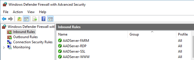 In case the option for Windows Firewall is selected, AADS creates and maintains the following Firewall rules: