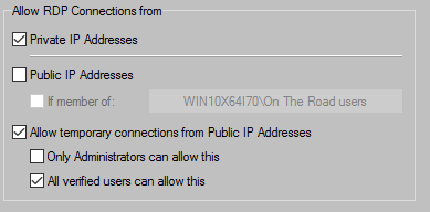 Either only Administrators or all Users can temporary allow RDP Connections from Public IP Addresses