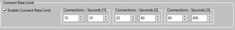 The built-in Firewall has Connect Rate Limit settings, such to prevent attacks on the Server. There are 3 increasing sets indicate the number of connections within a given amount of time. These 3 sets are applied when the same IP Address does multiple connections to the Server. When exceeding this number of connections, the attempts from the Client to do more connections are denied. The current active connections which were within the limits of the 3 sets, are allowed; the current active connections are not disconnected when the "next" connection attempt from the Client exceeds the Connect Rate Limit sets.
