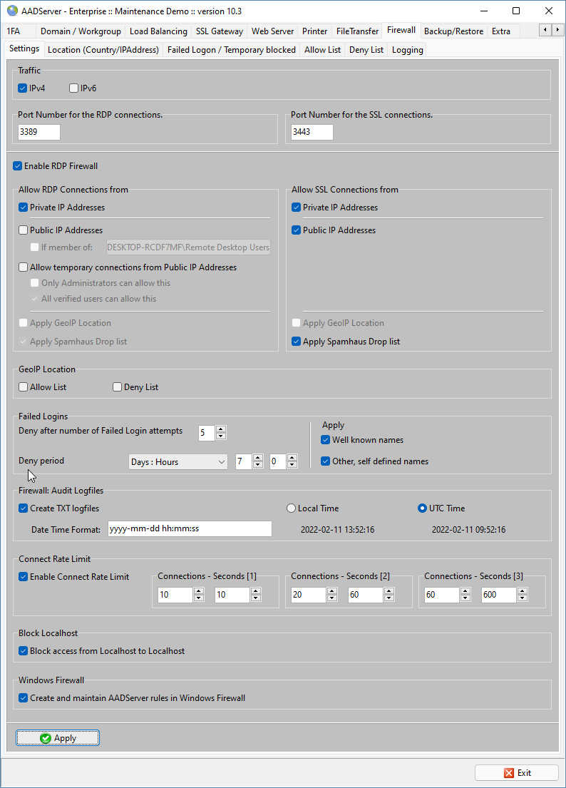 Don't be tempted to disable the AADS built-in Firewall. Too often we receive ZIP Support Files with loglines indicating many hack-attempts because of a disabled AADS RDP Firewall or no Firewall at all. This also applies to local networks. If one (or more) of the Client PCs are hacked, infected, the virus on the Client PCs may attempt to login on the AADServer and is doing many RDP-logins. Regularly we receive ZIP Support Files with these type of problem...