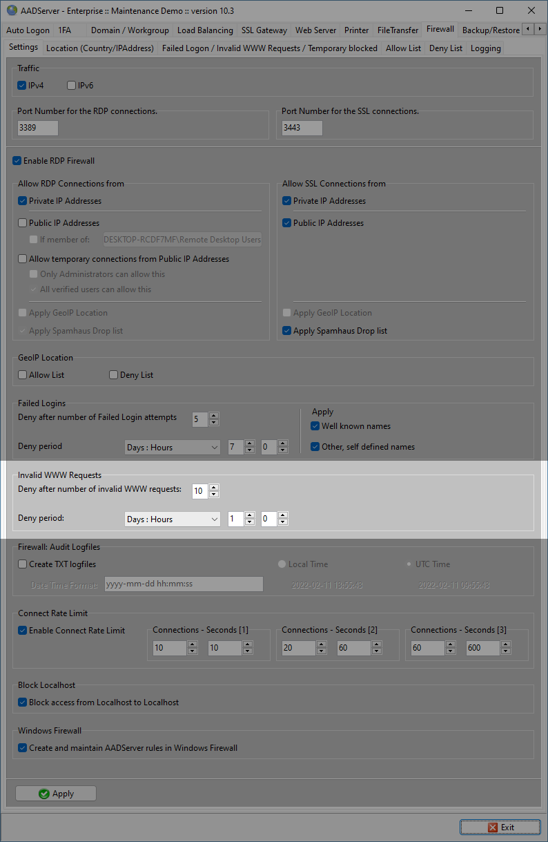 In case the Webserver is activated and applied, the AADS RDP Firewall does also handle invalid WWW requests towards the Webserver: