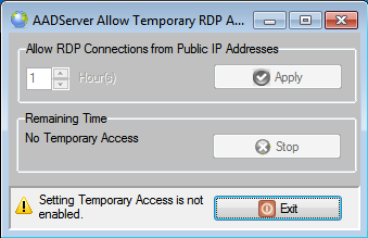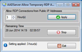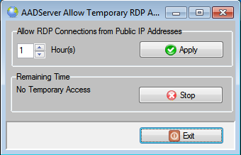 When the remote administrator is done with his job, the user can optional click on the Stop-button, and the period for allowing RDP connections from Public IP Addresses is terminated immediately.