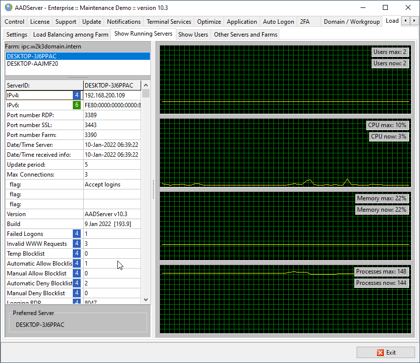 The Farm contains 2 Terminal Servers. Select one of the Terminal Servers in the Farm, and a history of the load is shown. Every 5 seconds the graphs are updated. The most recent load is shown on the left in the graphs, and is mentioned by the numbers in the upper right corner of the graphs.
