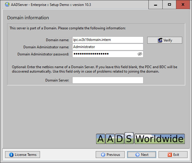 Please read the paragraph about Domain Authorization . This paragraph shows screen-dumps of what you should enter in the 4 fields as shown here in the AADS Terminal Server Setup program.