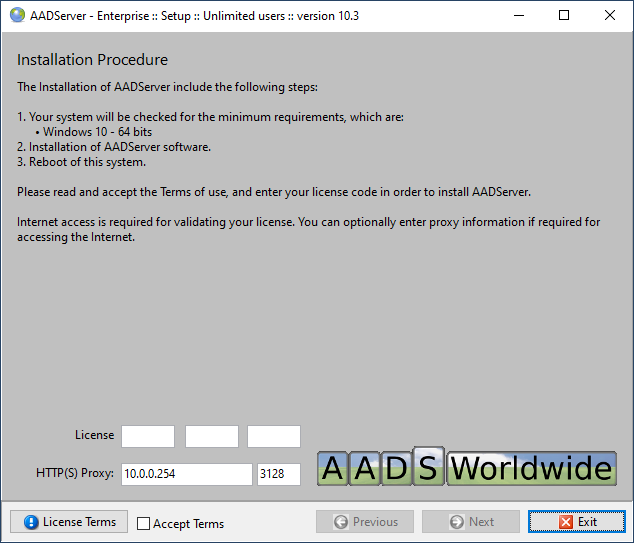 Only an user with Elevated Administrator access on the system can install the AADS Terminal Server software.