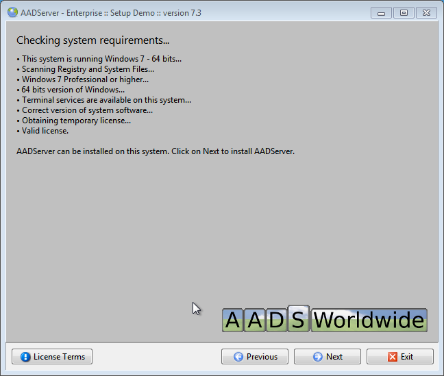The AADS Terminal Server Setup program checks whether or not the installation of AADS Terminal Server is possible: