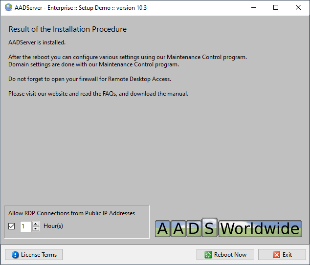 Default setting for the built-in RDP FireWall is that RDP connections from public IP Addresses to the AADS Terminal Server are blocked. However, because the Administrator is busy with installing and configuring AADS, it might be required to temporary allow RDP Connections from Public IP Addresses. Default it is possible to access the AADS Terminal Server from public IP Addresses for 1 hour after the reboot. The Administrator who is installing AADS can change this to a maximum for the next 48 hours.