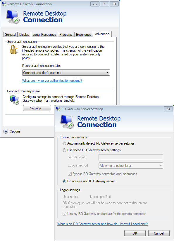 Server authentication is intended for connecting to a Microsoft Terminal Server, including a certificate for the Server. This option of the Microsoft RDP Client is not applicable when connecting to an AADServer.
