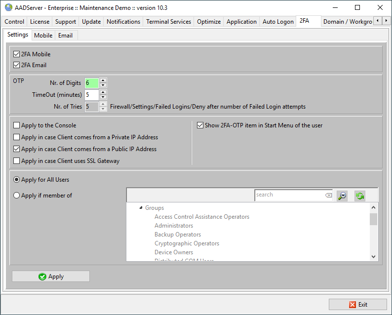 2FA can be applied to all users, or can be applied based on membership of a Windows Group.