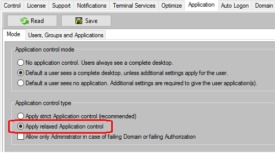 The objective of "Optimize" is to improve the response and performance of the Terminal Server and give a similar user-experience as default Windows. Because of this objective, "Optimize" does not apply Restrict Application Control, but does apply Relaxed Application Control: