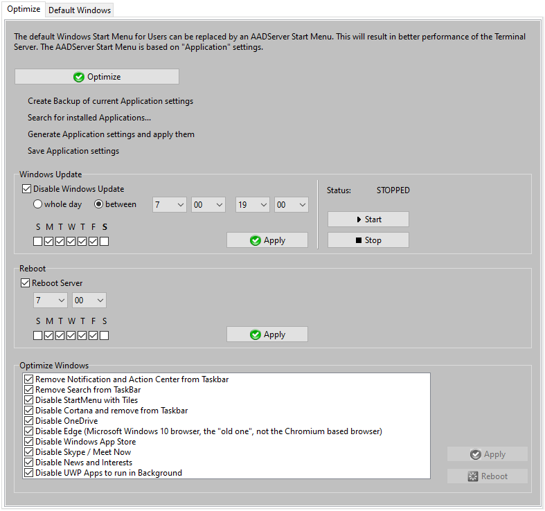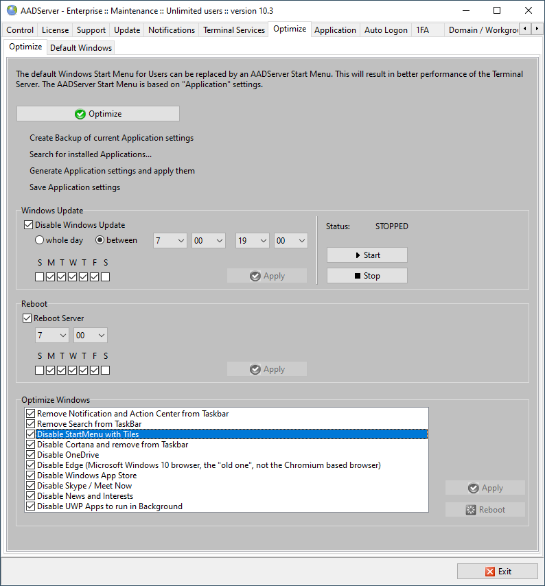 The objective of "Optimize" is to disable some Windows functions and settings and replace the Window Start Menu with an AADS Start Menu. These Windows functions and settings are not always needed on a Terminal Server, and do consume a lot of CPU and Memory. When these Windows functions are disabled, the response and performance of the Server will be noticeable better, certainly with 10, 20 or more concurrent users.