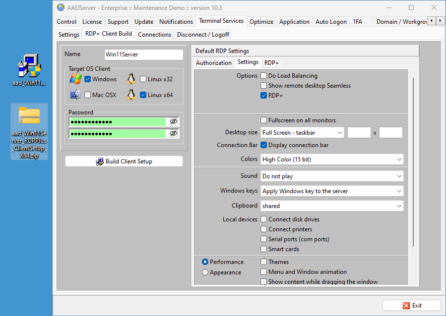RDP+ requires the AADS Client software on the client. You can easily build a Client Setup build for Windows, Mac OSX and Linux.