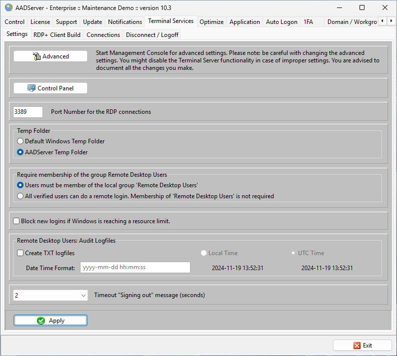 When you check the option "Block logins if Windows is reaching a resource limit", new logins on this AADS Terminal Server are blocked as long as the server has a "to-high" cpu utilization.