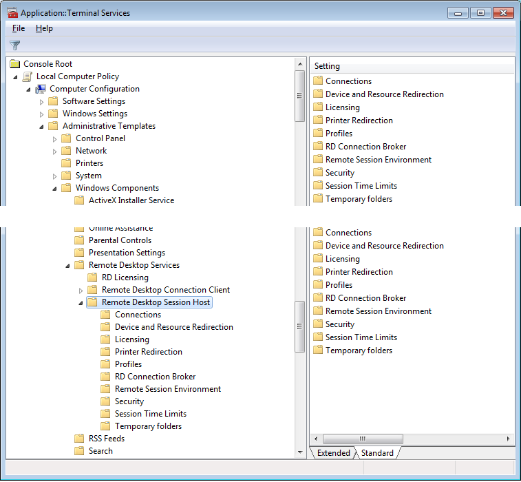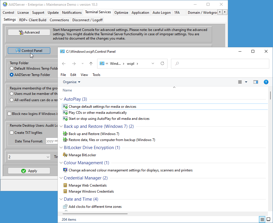 Please note: not all Remote Desktop options are implemented. Several Remote Desktop options are displayed because AADS Terminal Server delivers 1 solution for various Windows versions.