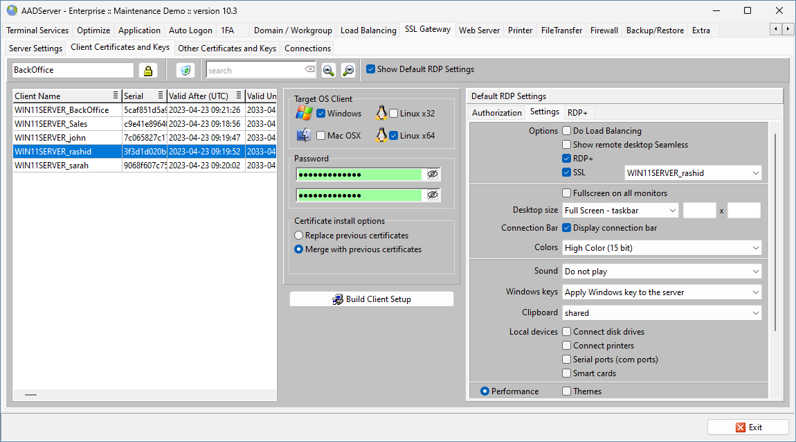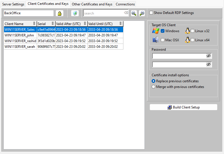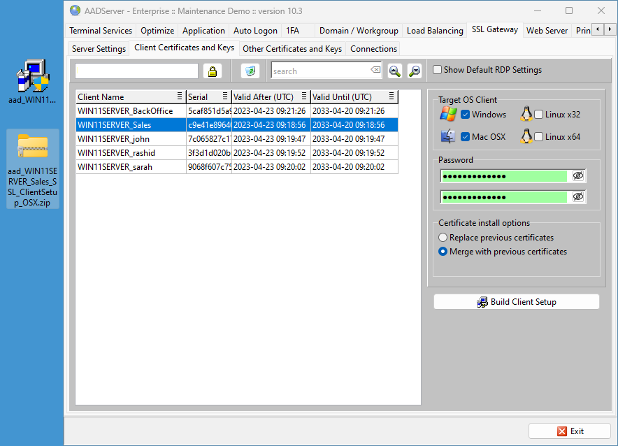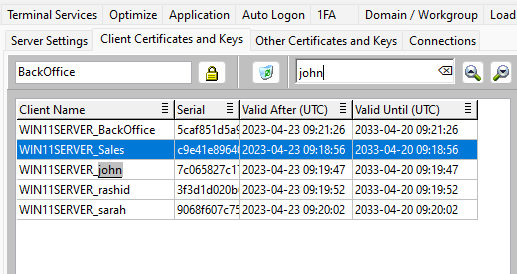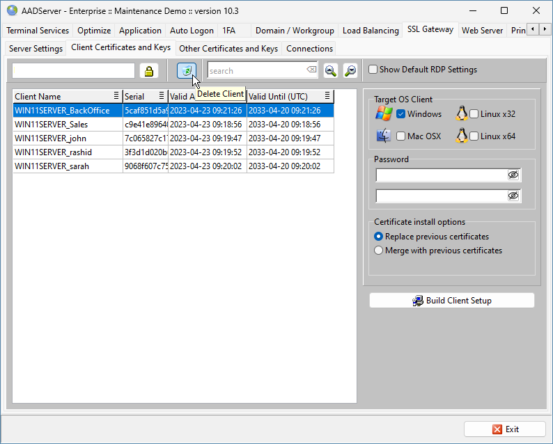 Using the Delete Client button, a Certificate- and Key pair of the selected user will be deleted. Any user that has this Certificate- and Key pair, will not be able any more to establish a connection with the AADS Terminal Server.