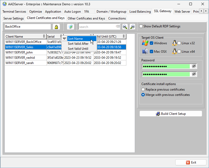 The option “Merge” can be used, for example, by the Administrator. When he has to administrate multiple different AADS Terminal Servers from customers, for each AADS Terminal Server of each customer he can do a Client Setup Build with the merge option, resulting in a big set of SSL certificates on his own client PC, such that he can work on each of the AADS Terminal Servers.