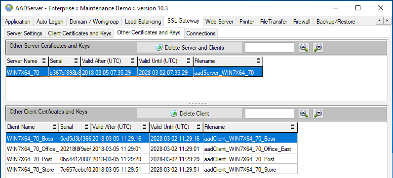 When the other Server and / or Client certificates are deleted, Client PC's can not connect anymore thru SSL by using the other Server and / or Client Certificates.