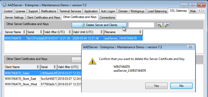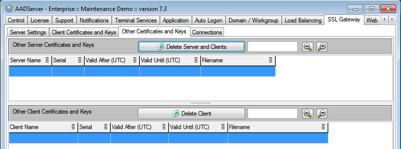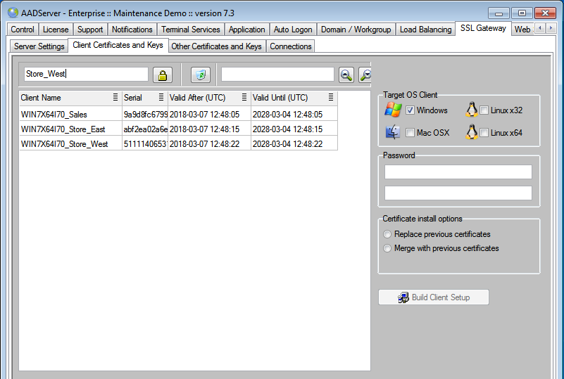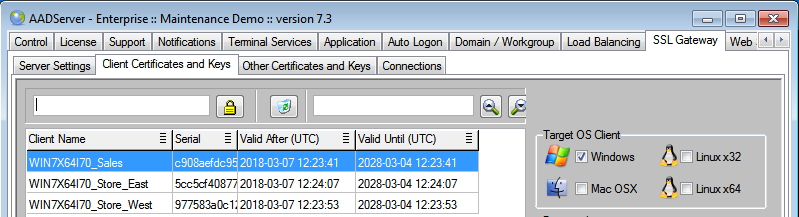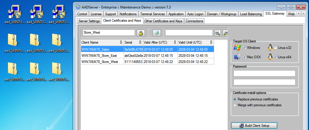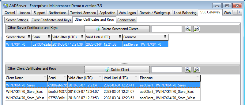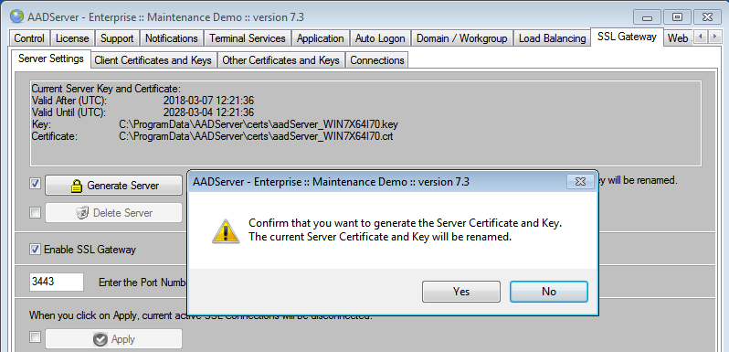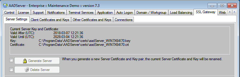 Because the SSL Gateway does generate its own Certificates, and it has no dependency at all on any third party for checking the validity of the Certificates, the SSL gateway has no need to trust anyone else in the world (including us, AADS WorldWide). Therefore the SSL Gateway generates Certificates that can be used for 10 years.