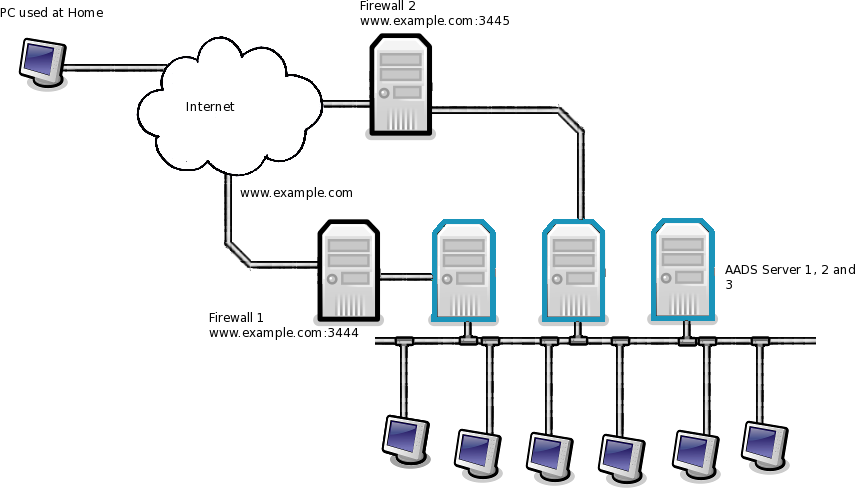 - Firewall 1 forwards port 3444 to the SSL Gateway on AADS Terminal Server 1.