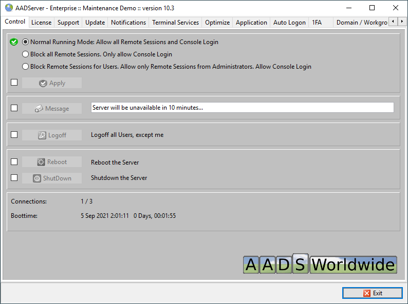 As shown in the example above, AADS Demo can handle 3 sessions, and currently there is 1 session active.