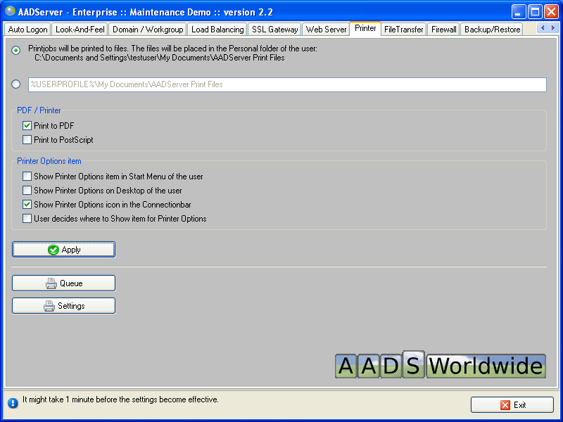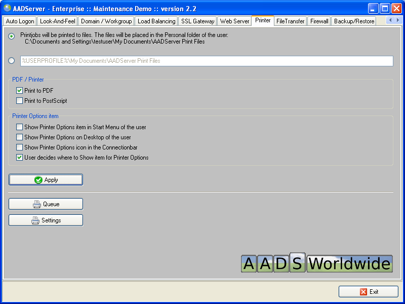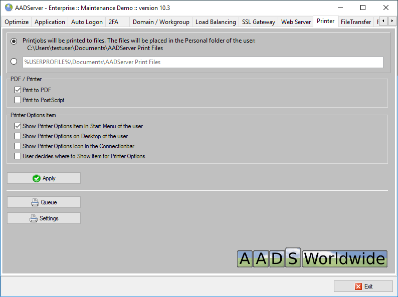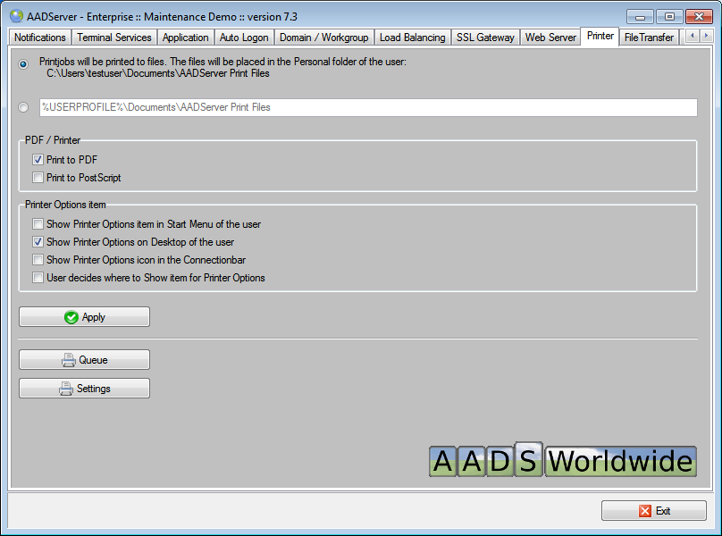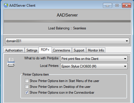 When not using AADS Client Software , only the first open "Leave print files on the Server" can be used, because the other options do need RDP+.