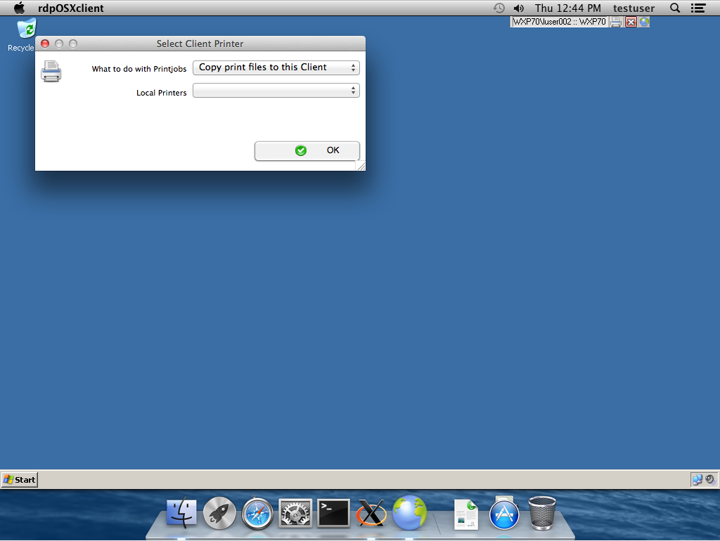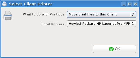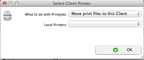 The User selects "Print print files to this Client", and selects 1 of the attached printers: