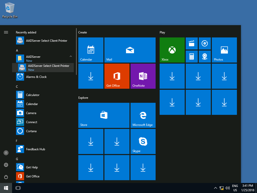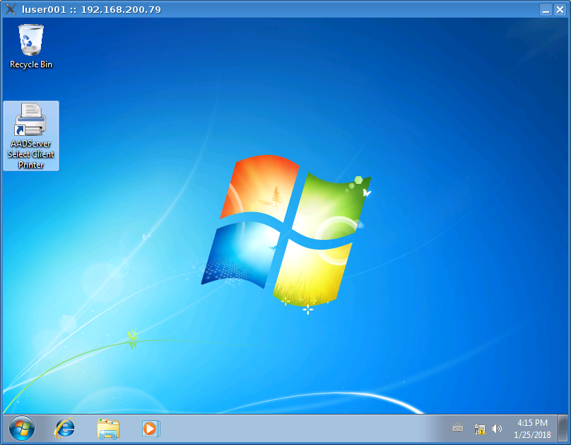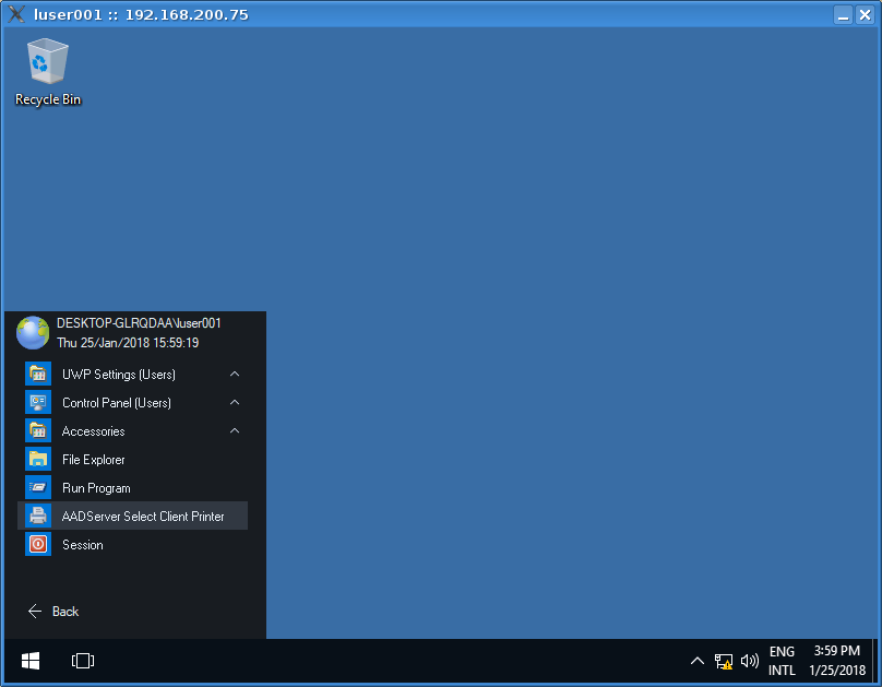 The User starts a Remote Desktop Session, using our AADS Client Software on the Client PC.. The User has a default Windows Start Menu in this example. The result is as follows: