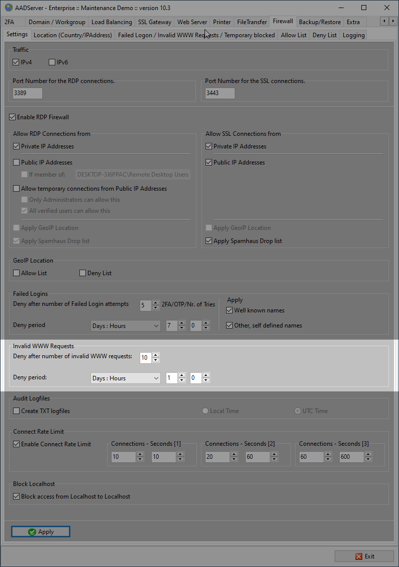 When the Webserver is enabled and running, the AADS RDP Firewall does also filter and handle invalid WWW requests: