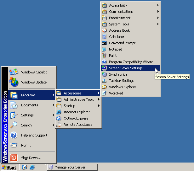 An entry is created in the "Accessories" menu for "Screen Saver Settings":