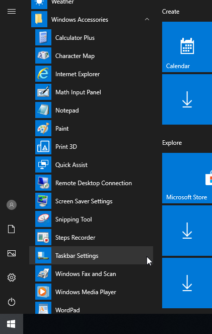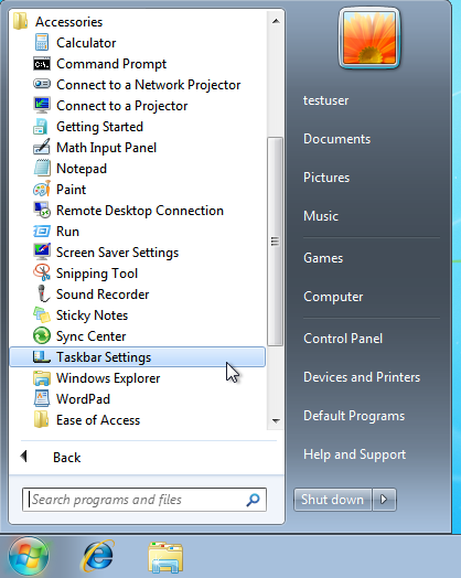 a tool and shortcut for "Taskbar Settings" is placed in the "Accessories" menu: