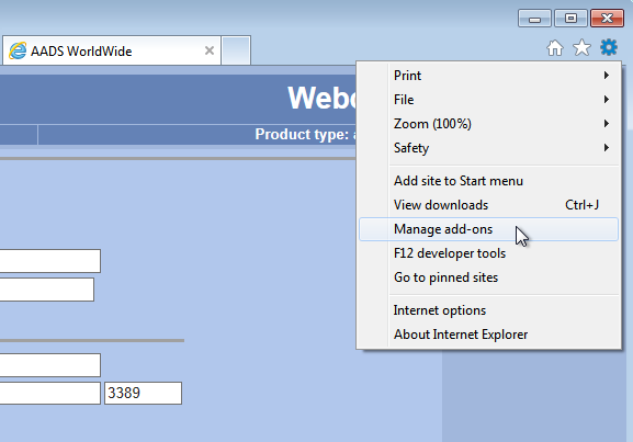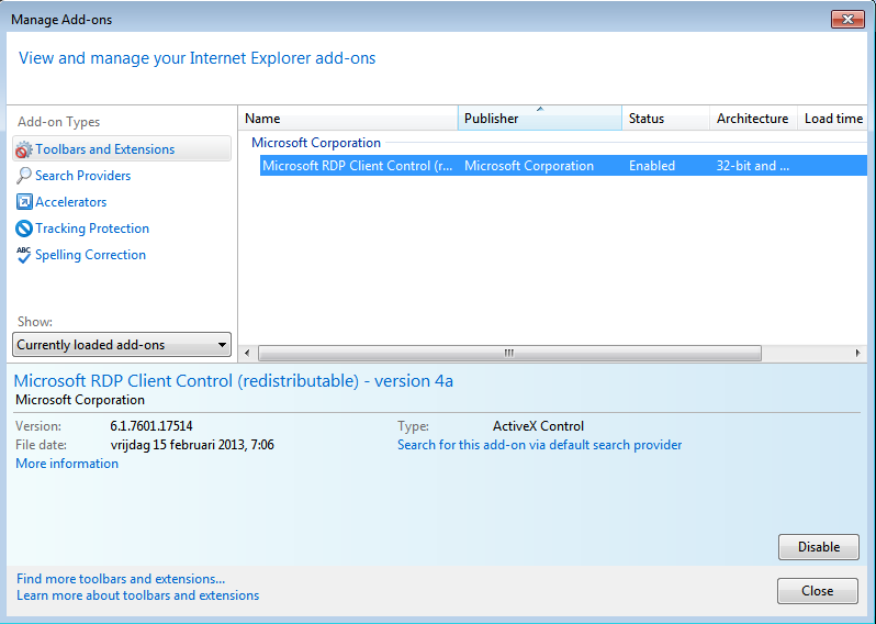 Using the "Tool - shaped" button, the user can verify that the Add-on "Microsoft Terminal Services Client Control" is enabled: