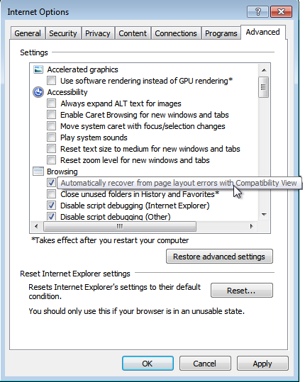 In case "IE Compatibility View " is disabled, the following error might be shown: