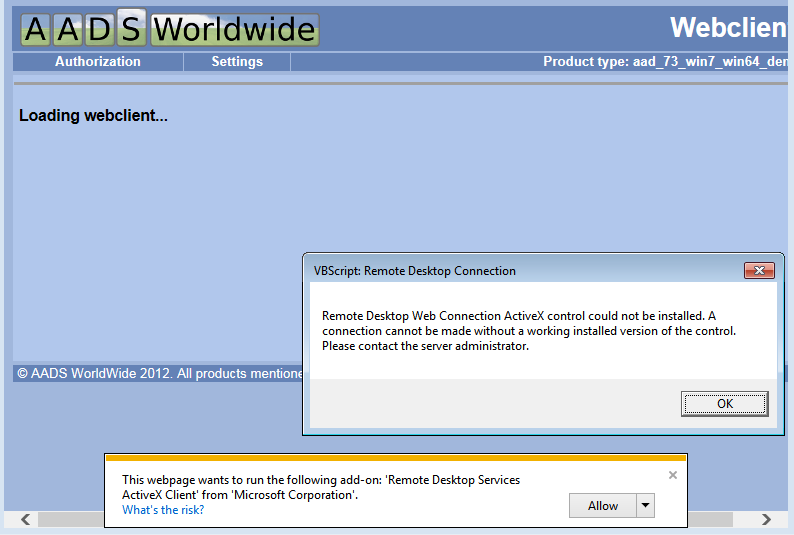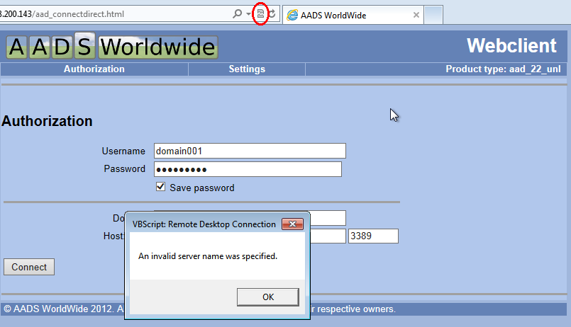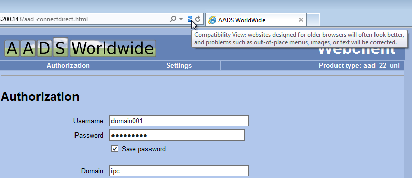 Click on the "IE Compatibility View - button" in the Addressbar and try again to connect to the AADS Terminal Server.