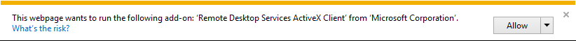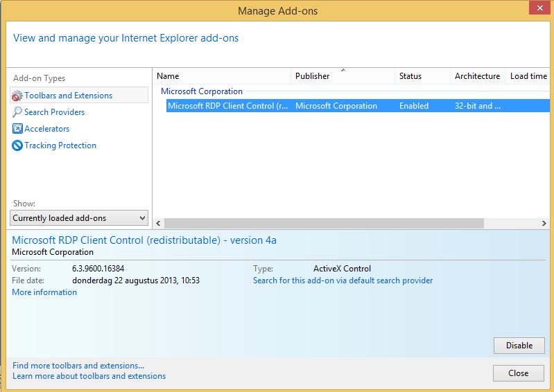 Using the "Tool - shaped" button, the user can verify that the Add-on "Microsoft Terminal Services Client Control" is enabled: