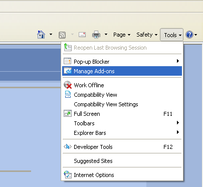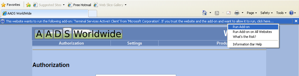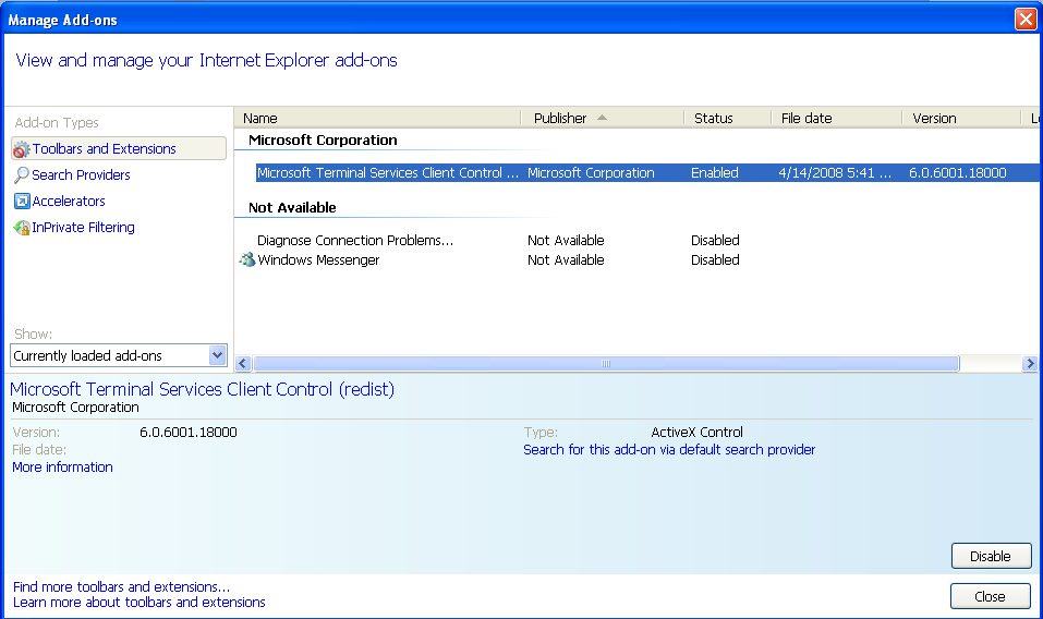 It is required to enable the Add-on "Microsoft Terminal Services Client Control". Using the "Tools" button, the user can verify that the Add-on "Microsoft Terminal Services Client Control" is enabled: